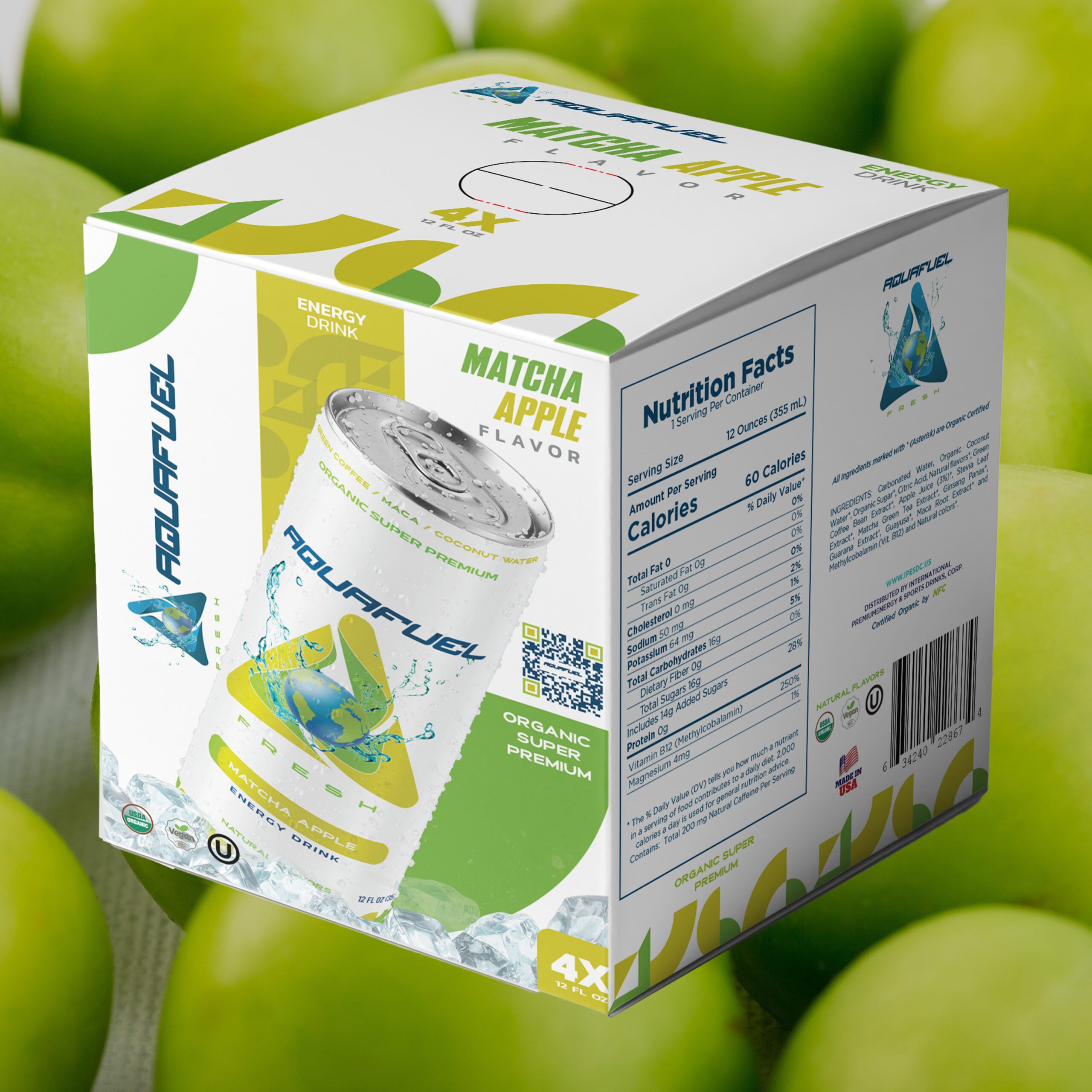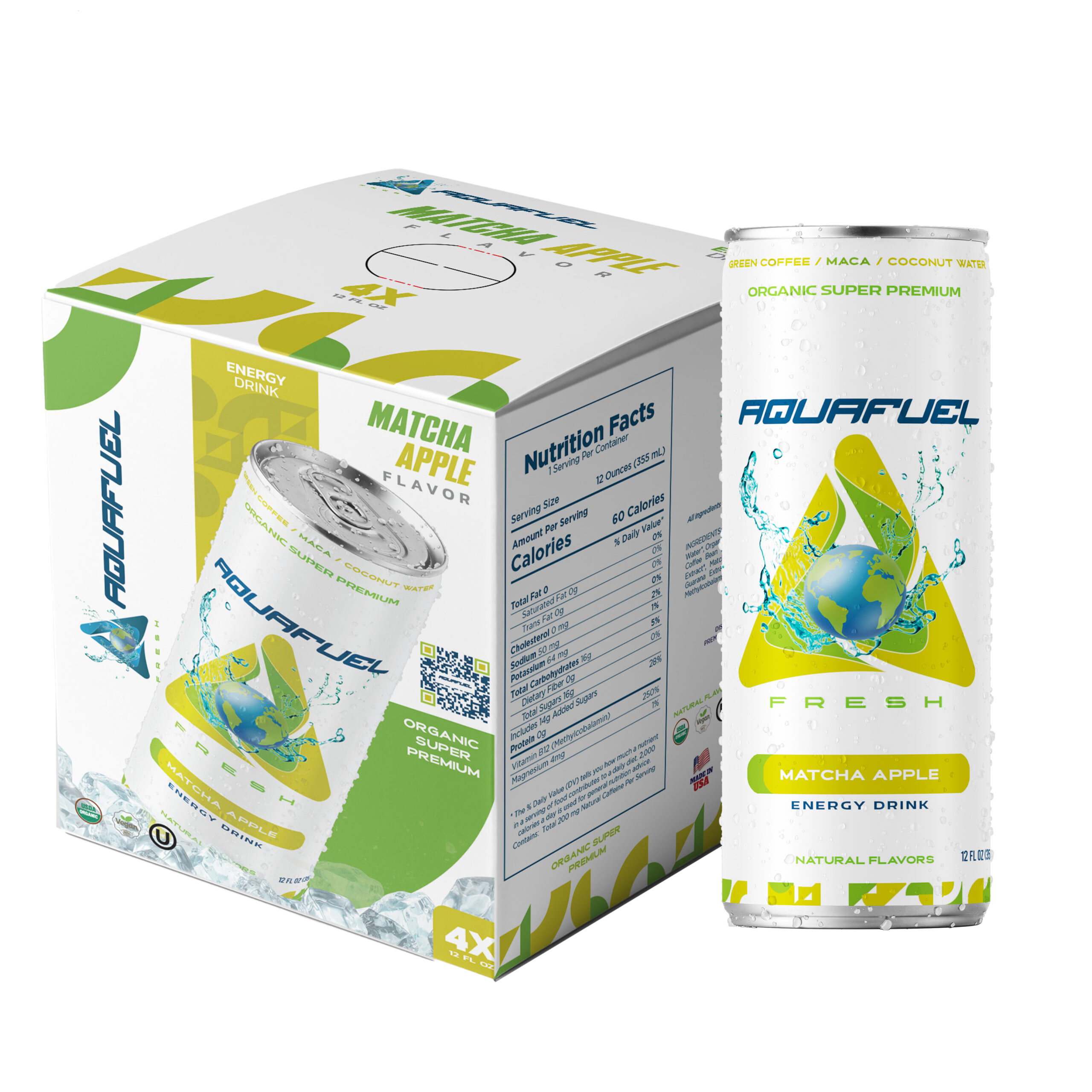 Carbonated Water, Organic Coconut Water*, Organic Sugar*, Citric Acid, Natural flavors*, Green Coffee Bean Extract*, Apple Juice (3%)*, Stevia Leaf Extract*, Matcha Green Tea Extract*, Ginseng Panax*, Guarana Extract*, Guayusa*, Maca Root Extract*,